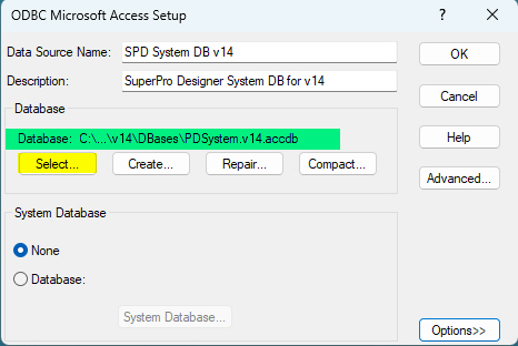 First type in the "Data Source Name" field: "SPD System DB v15'. Then click on "Select" button (yellow highlight above) and in the file selection dialog that ensues, locate and select the file "PDSystem.v15.accdb". Make sure this file is located in an area of your PC that is going to be accessible (with read-and-write privileges) by all the users of the application. The file should have been copied to the following folder (by default):