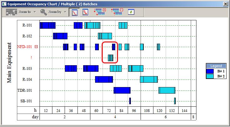 The equipment items were defined at the suite level. For instance, the figure below shows the two filters (NF-101, 2) and the three vessels (V-101, 2, 3) defined in Suite A. These equipment items can only be utilized for processing activities taking place in Suite A. Activities in Suite B and in ChemTech have not access to equipment in Suite A.