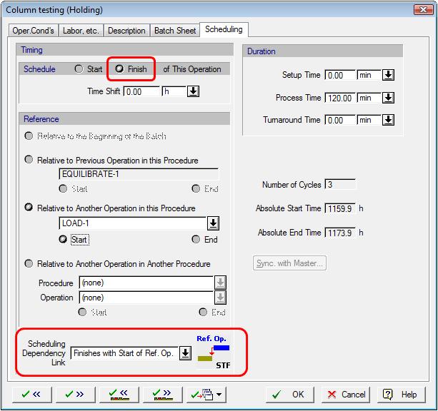 Master-Slave Relationship Improved. You can now accurately match-up the duration of an operation to the duration of another operation, even if the procedures that they belong to have a different number of cycles per batch. For instance, if you transfer material out of a tank to load a chromatography column and the column handles a batch in three cycles, the duration of the transfer out operation in the tank will span the interval between the beginning of the first load to the and of the last load operation in the chromatography column. You can also match the duration of an operation to the duration of a string of operations.